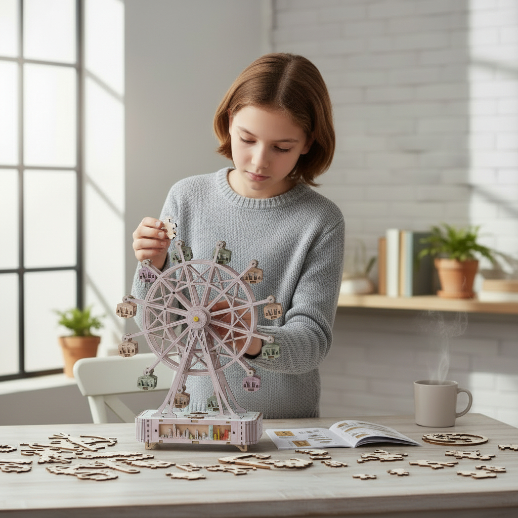 Lassen Sie Ihrer Kreativität freien Lauf und begeben Sie sich auf eine entzückende Reise mit dem 3D-Holzpuzzle R-F3.2 TOY1153-002 mit faszinierendem Riesenrad-Design. Dieses aufwendig gefertigte Holzpuzzle stellt nicht nur Ihre Montagefähigkeiten auf die Probe, sondern erweckt mit seinem bezaubernden Sound und den LED-Lichteffekten auch Freude zum Leben. Dieses aus hochwertigem, umweltfreundlichem Holz gefertigte 3D-Puzzle zeugt von exquisiter Handwerkskunst und sorgt nach der Fertigstellung für eine atemberaubende Optik.